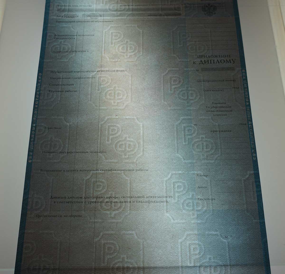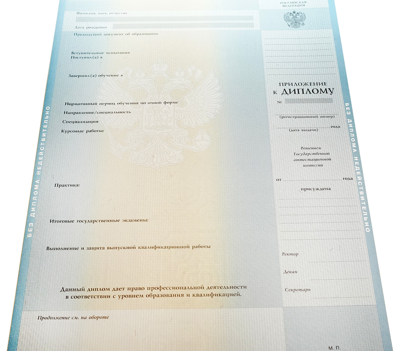 Дипломы изготавливаются на государственных бланках, имеют высокое качество и защитные элементы. Компания RusDiplomy сотрудничает с большим количеством ВУЗов в стране, поэтому не является проблемой получить бланки конкретного учебного заведения, с подписями от уполномоченных сотрудников.
